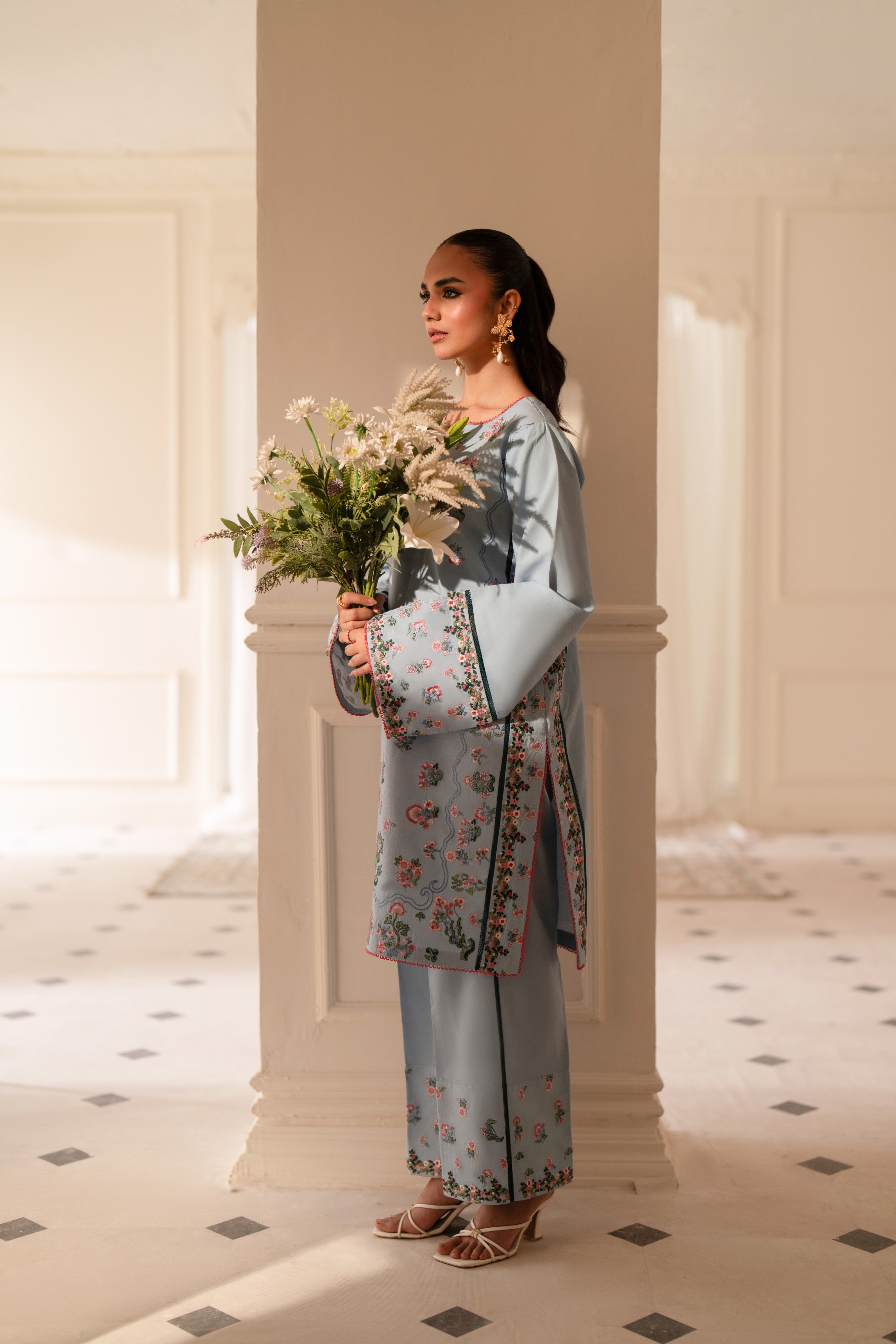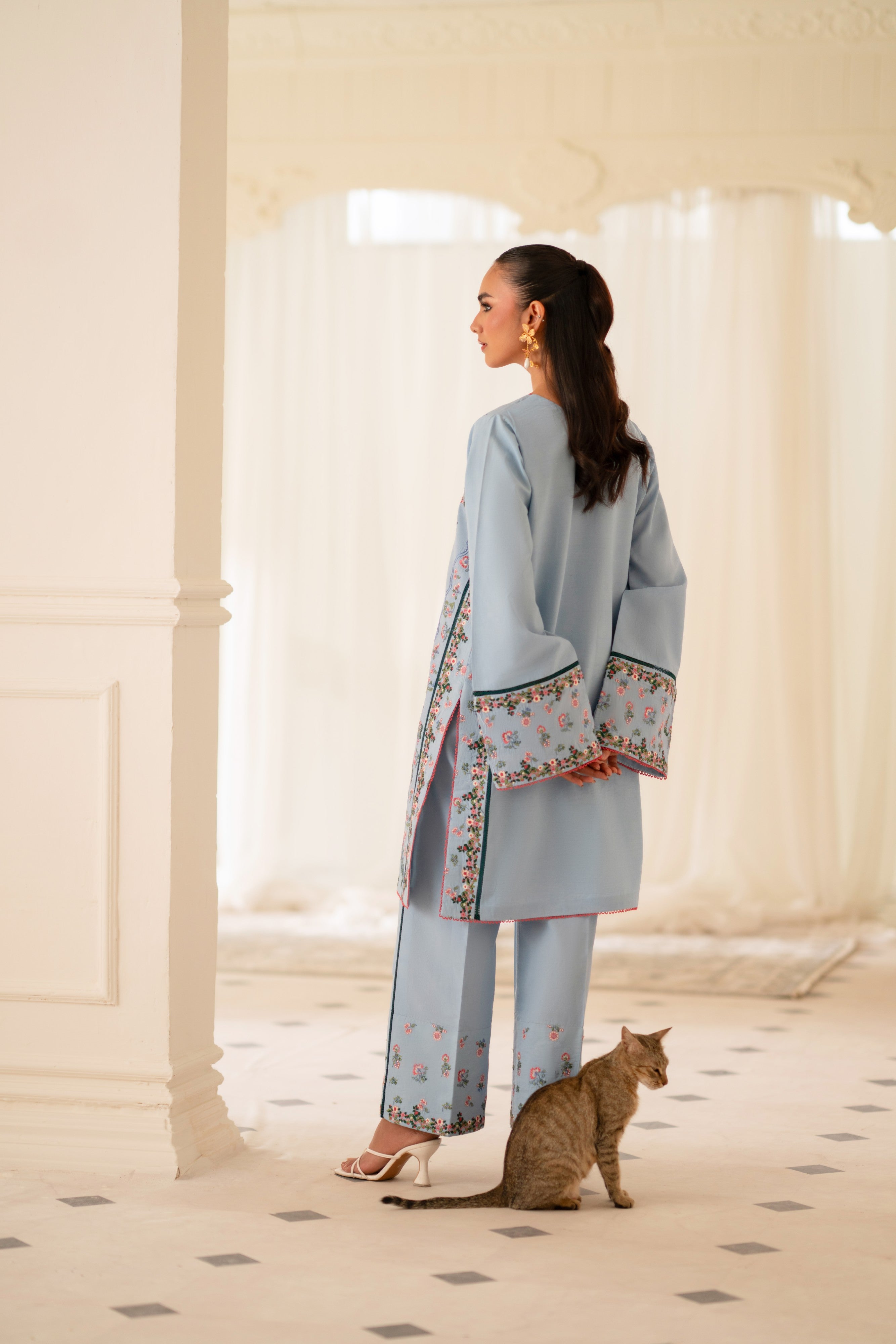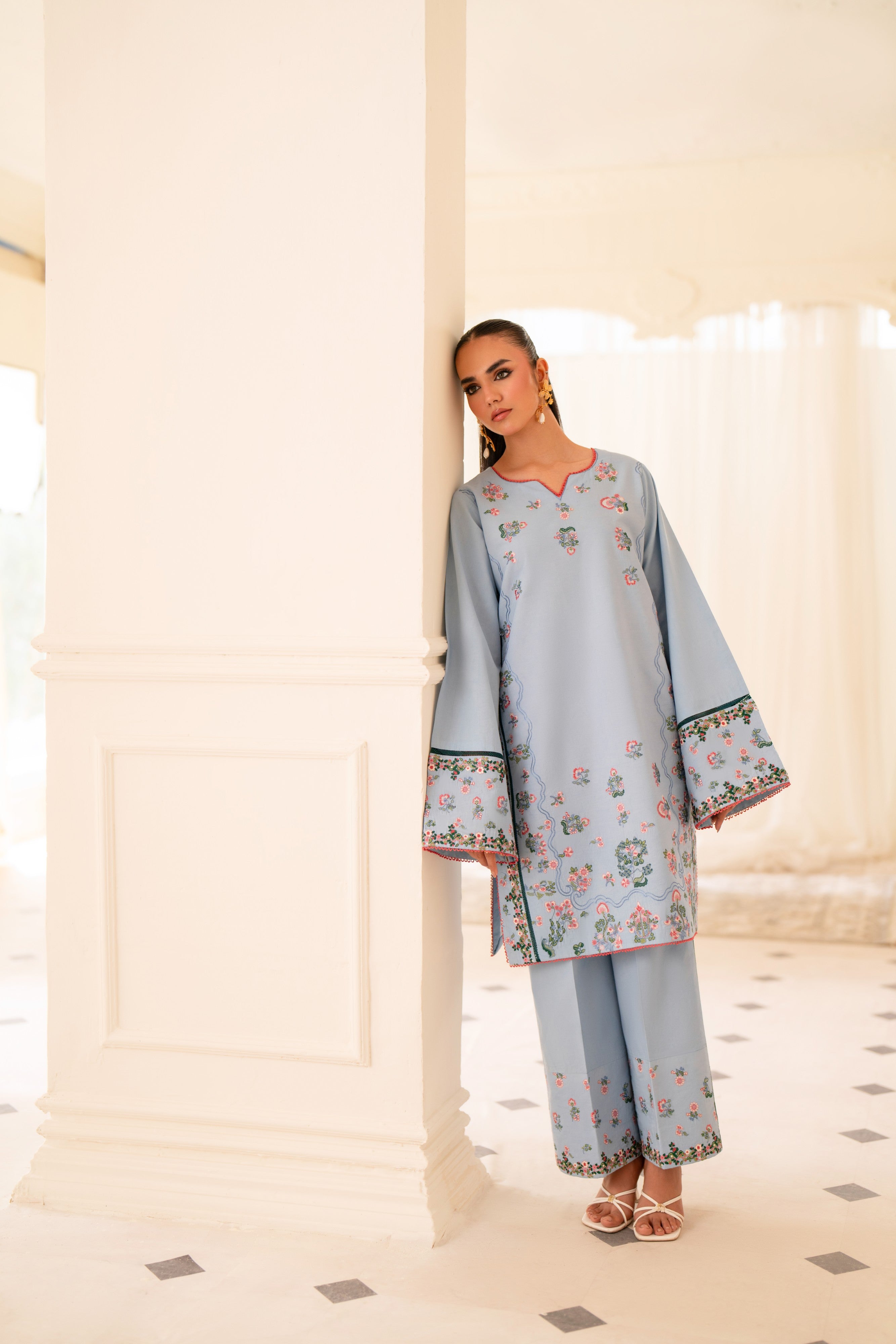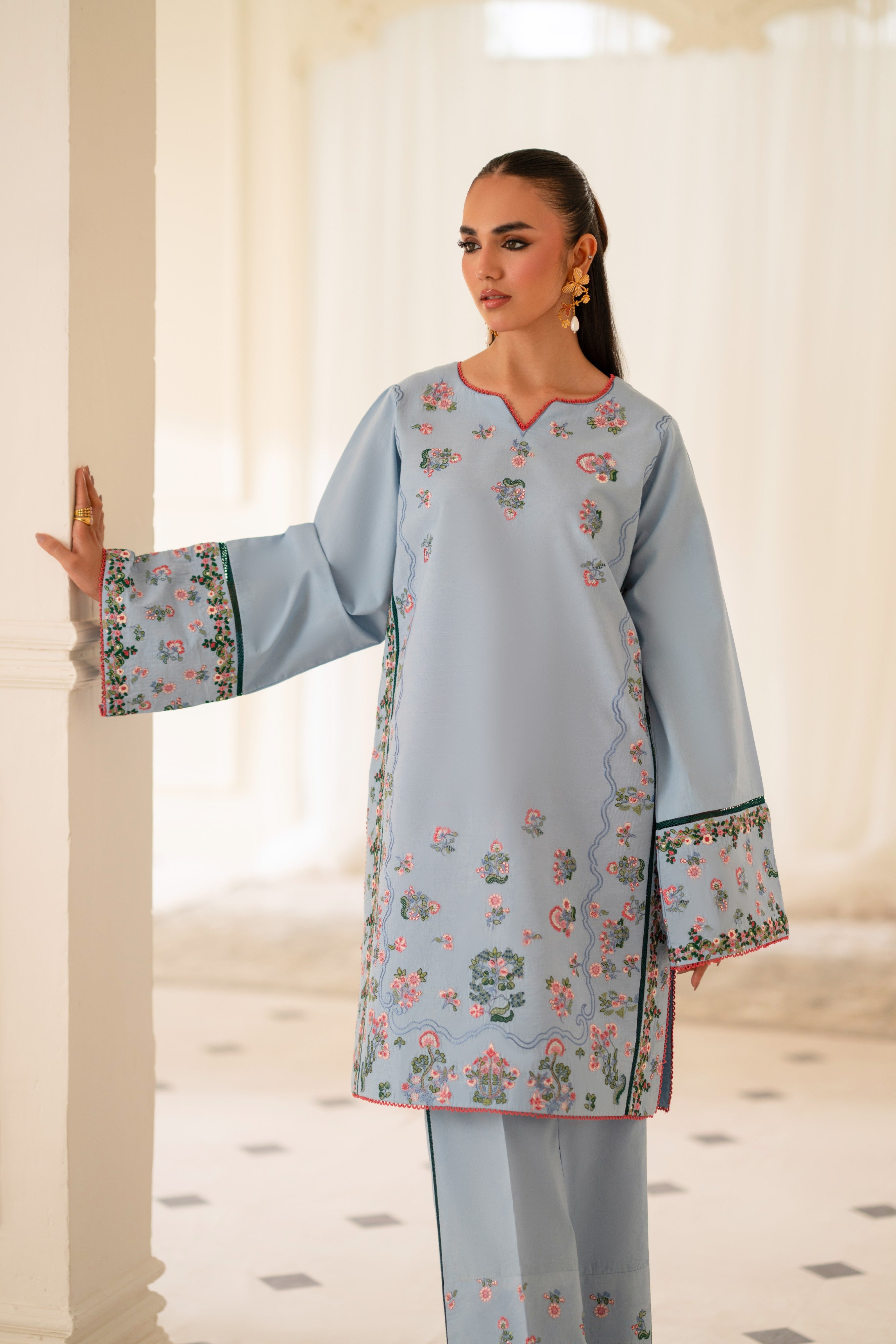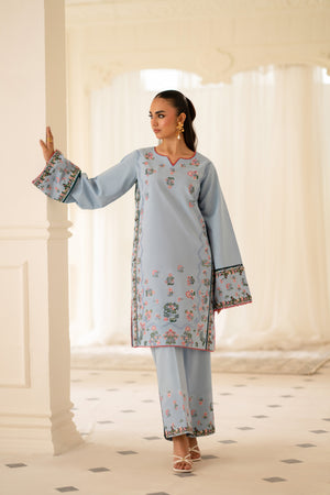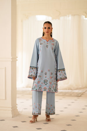 Project confidence and sophistication with our sky blue two-piece stitched dress, paired with matching embroidered trousers. The dress's classic design and the trousers' intricate embroidery converge to create a truly executive and refined look, ideal for professional settings.