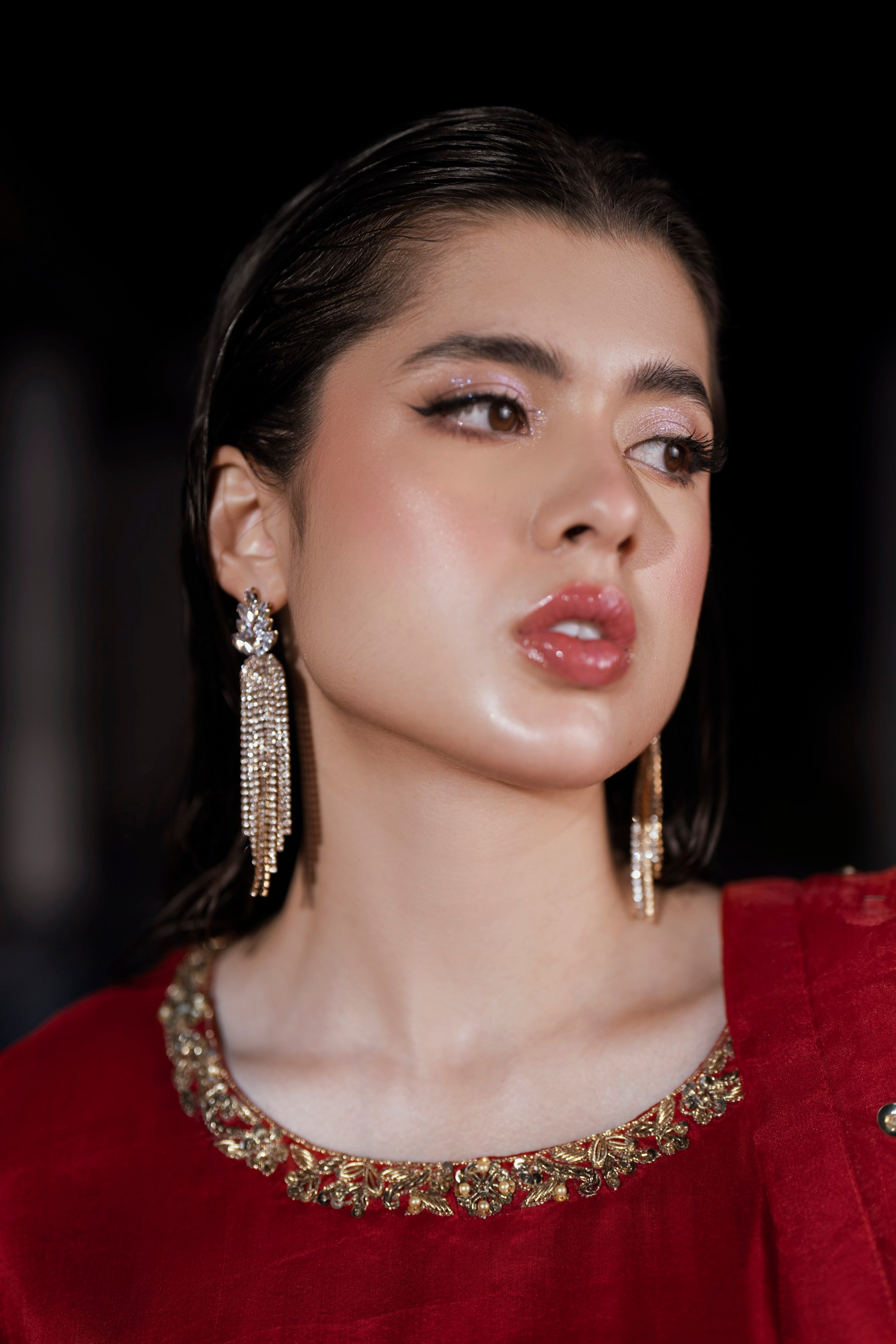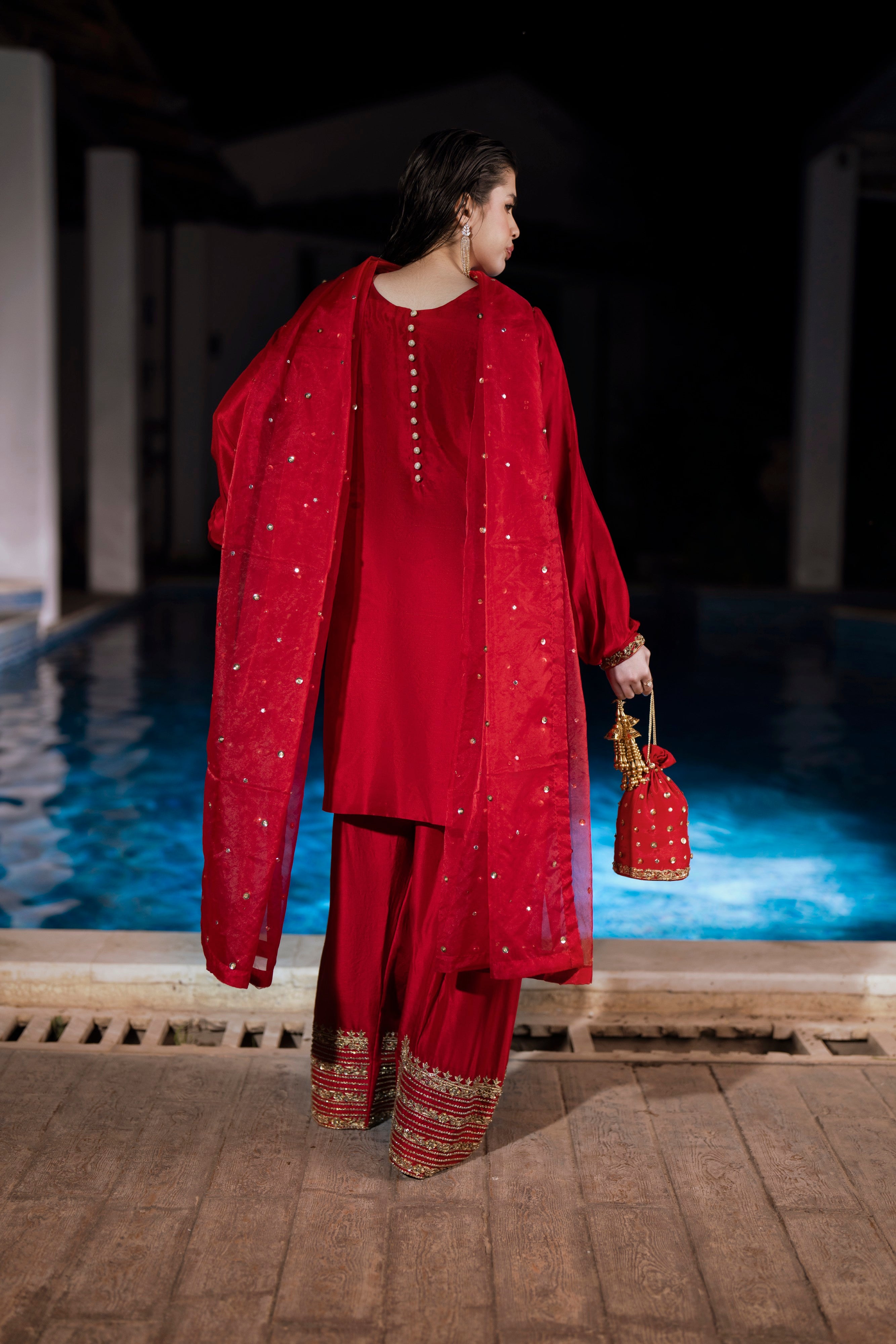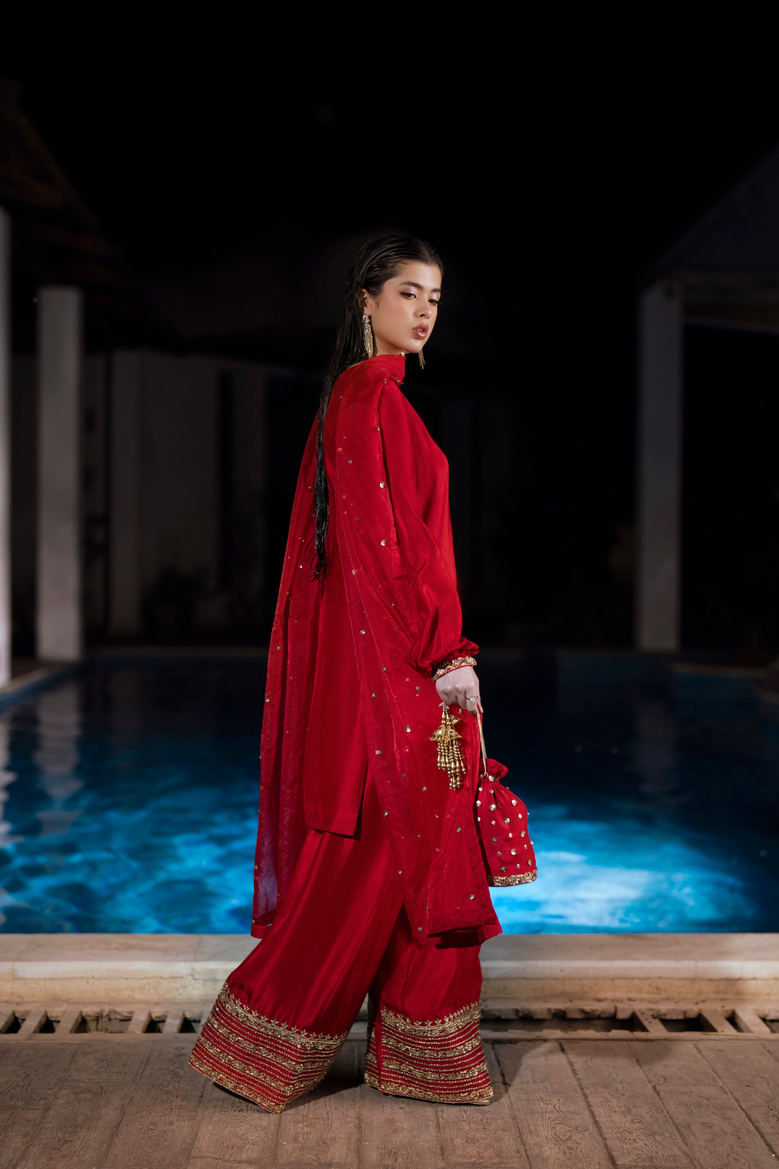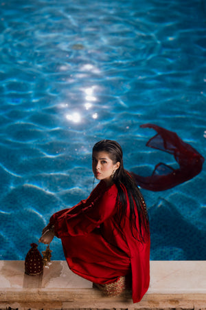 This exquisite red 3-piece ensemble is crafted from pure 60-gram silk, radiating richness and sophistication. The farsi shalwar showcases intricate hand embroidery featuring dabka, sitara, zari, and delicate pearls, reflecting timeless craftsmanship. Complementing the look is an organza dupatta adorned with modern chata work, adding a graceful contemporary touch. Together, the pieces create a perfect balance of tradition and modern elegance — a statement outfit that embodies Feyre’s signature artistry and refined charm.