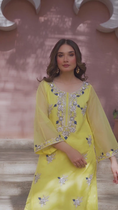 ‘Nureh’ features a traditional shirt adorned with exquisite adda work, embroidery and embellishments. Delivering splendid intricate details on this gorgeous pure organza canvas, paired with Korean raw silk pants and a pure organza dupatta making it a timeless addition to your wardrobe.