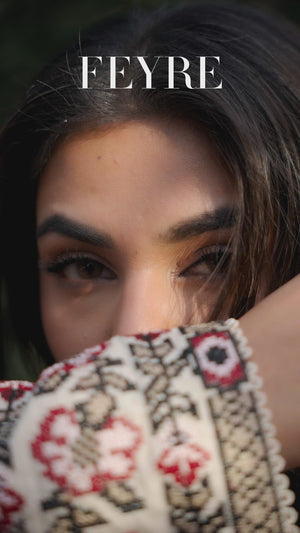 A statement in contrast — Flint fuses earthy sophistication with bold artistry. The ivory khaddar base is adorned with intricate embroidery in hues of deep rose and charcoal, paired with black printed trousers that balance modern structure and timeless charm.