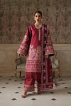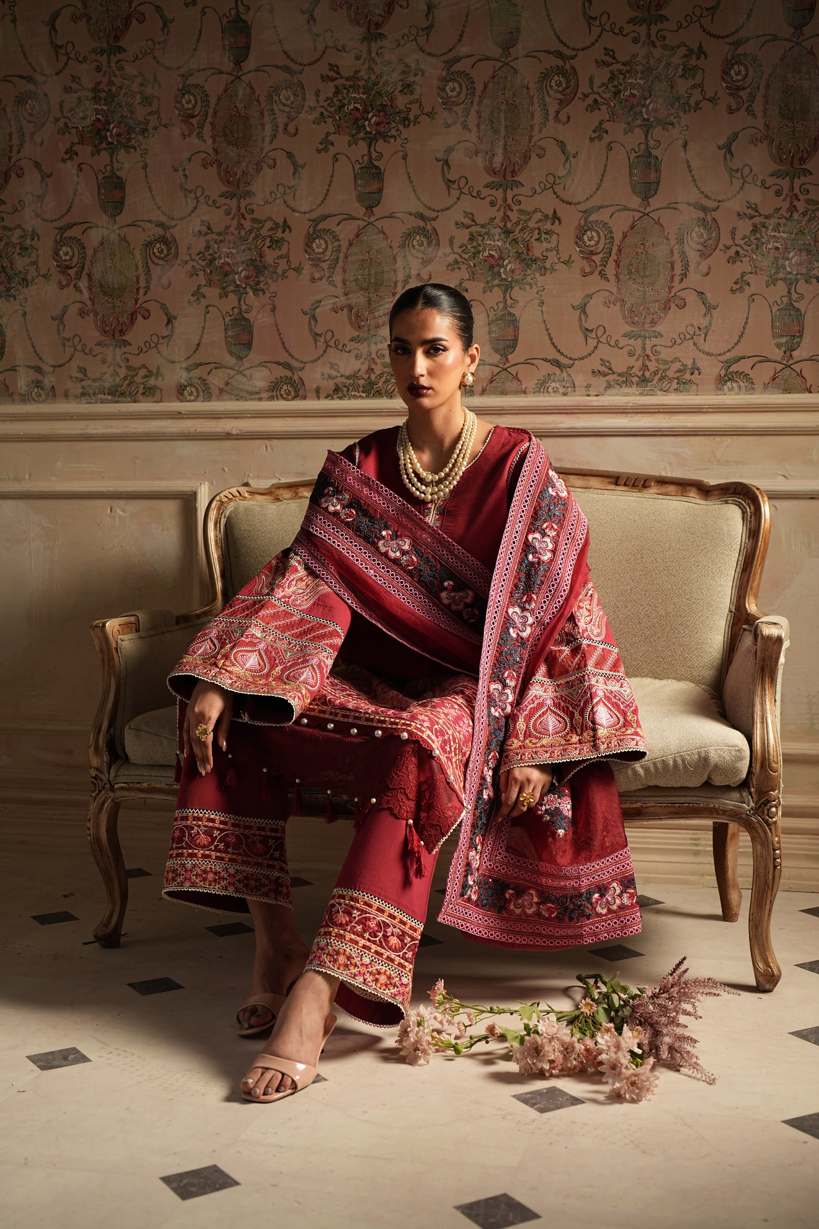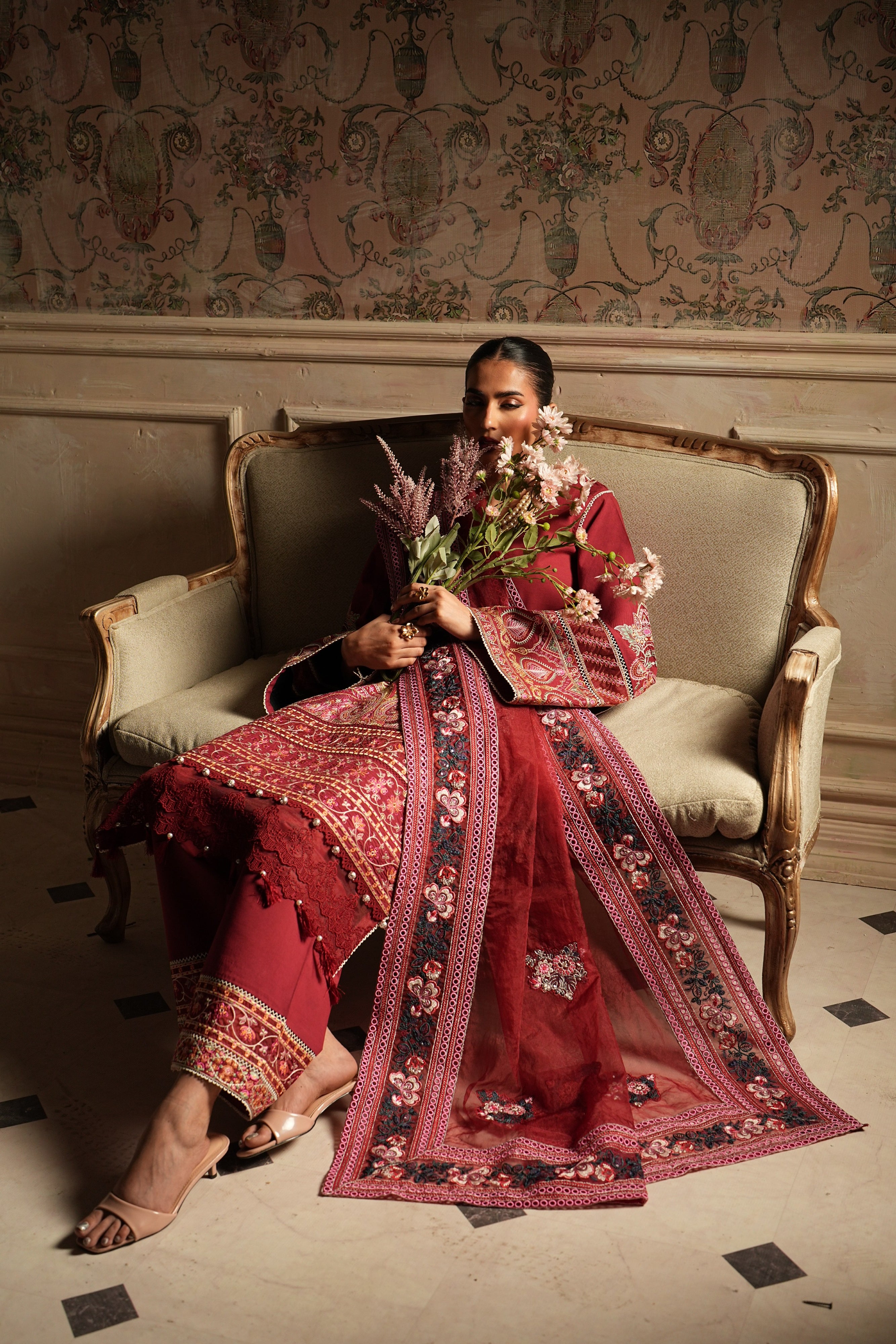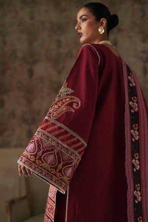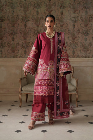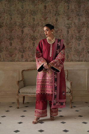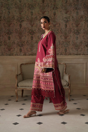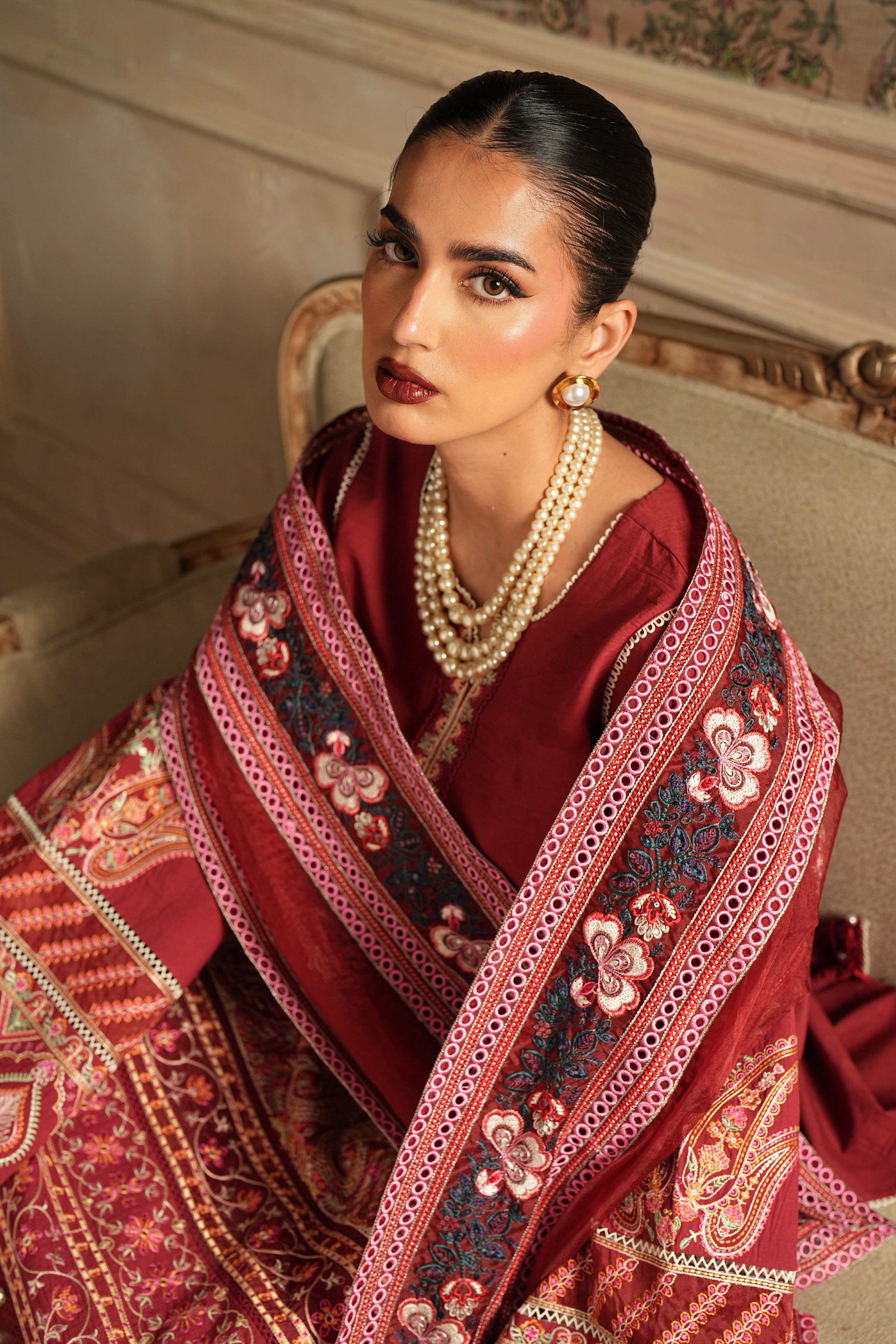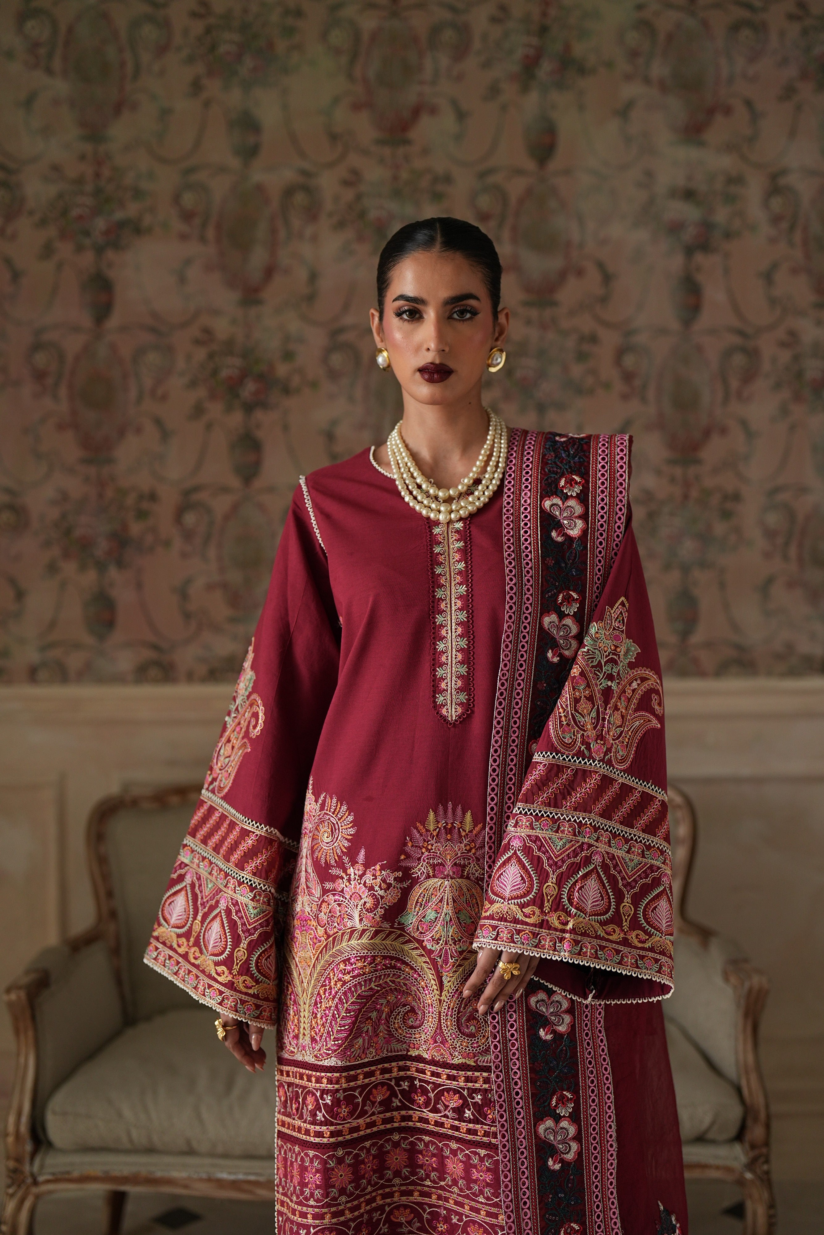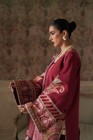 A rich maroon ensemble adorned with intricate embroidery and elegant detailing. Featuring a beautifully embellished shirt, statement sleeves, a finely detailed dupatta, and matching wide-leg trousers, this outfit is perfect for festive gatherings and formal occasions.