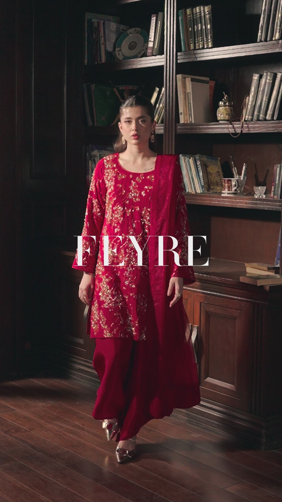Our Nature-Inspired Article captures the beauty and spirit of the wild in Feyre’s signature style. This deep maroon ensemble features a heavily embroidered deer motif, intricately crafted with imported cut dana, sitara, and pearls, reflecting a fusion of elegance and strength. Paired with a modern tailored trouser and a simple organza dupatta, the design beautifully balances statement craftsmanship with understated sophistication — a true expression of Feyre’s artistic connection to nature.