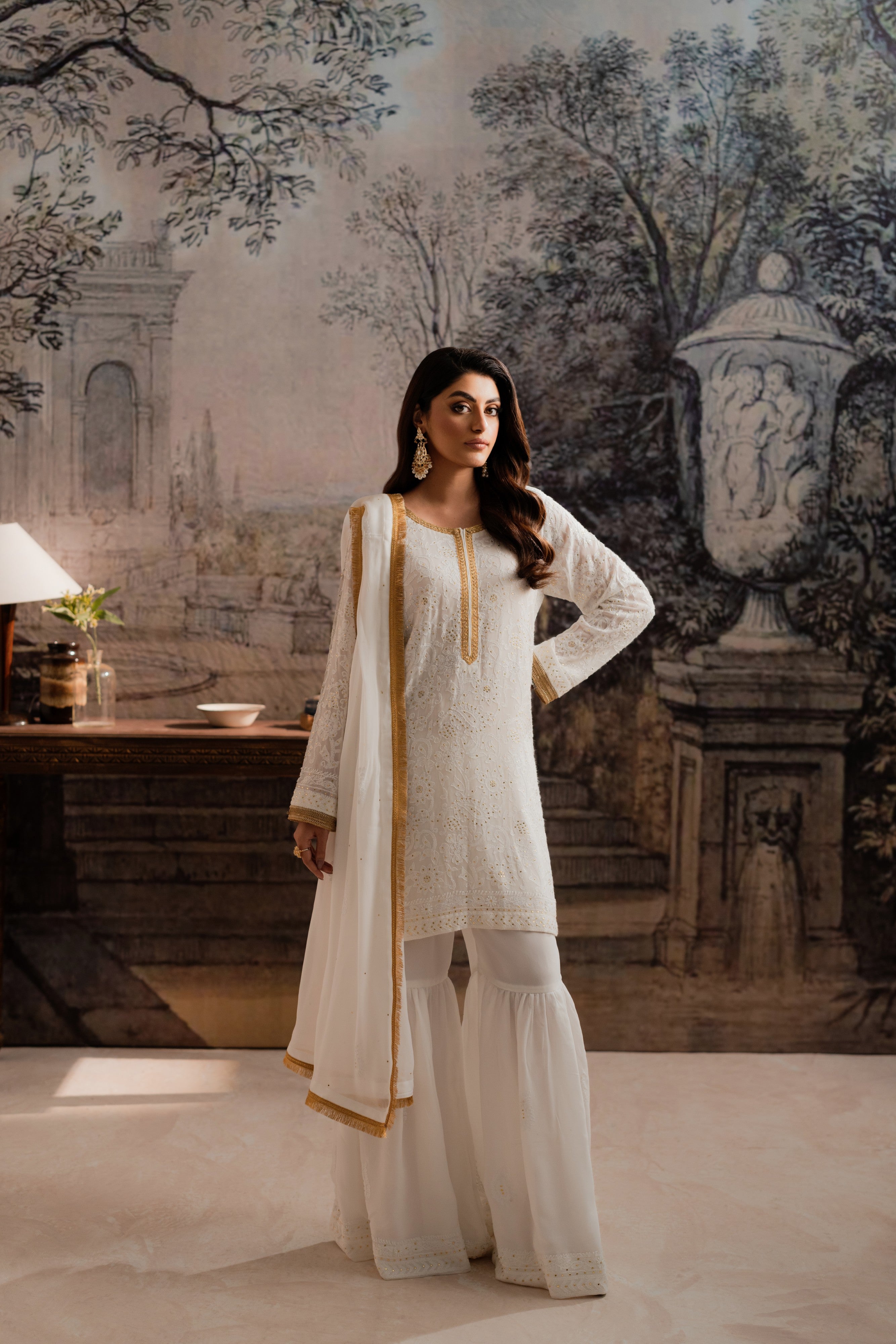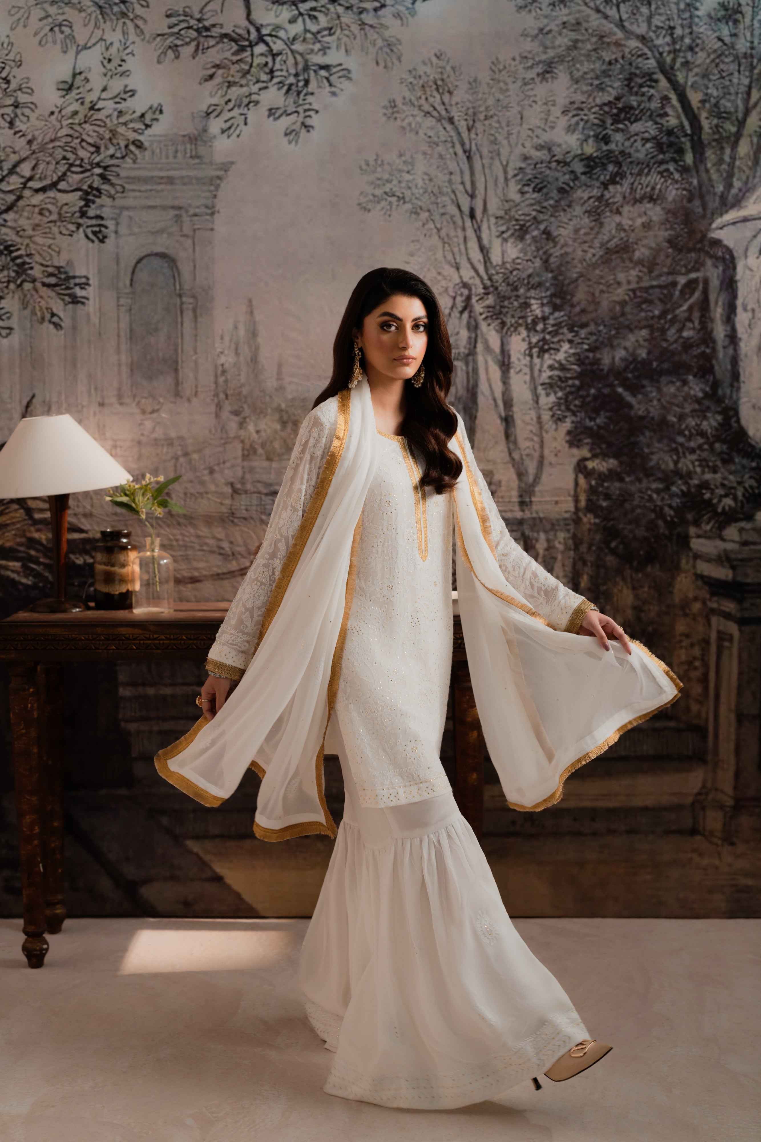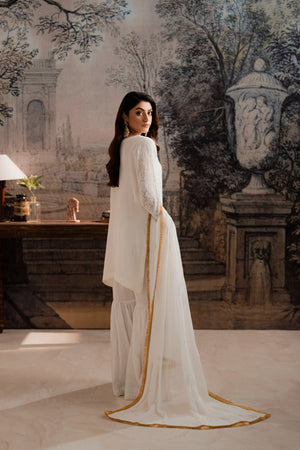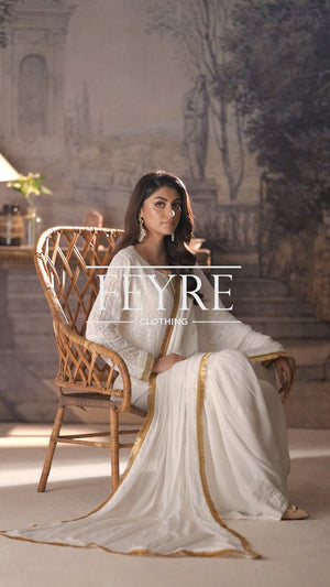 Make a statement with Feyre's exquisite chiffon gharara set, where traditional craftsmanship meets contemporary chic. Pure chiffon fabric provides a stunning canvas for intricate Mukesh and Chikankari shadow work, beautifully accentuated with delicate lace. A flowing chiffon dupatta completes this majestic ensemble. With its flawless blend of heritage techniques and modern flair, this set is a testament to Feyre's design excellence. Ideal for weddings, festivals, or formal events, it radiates refined elegance and sophistication.
