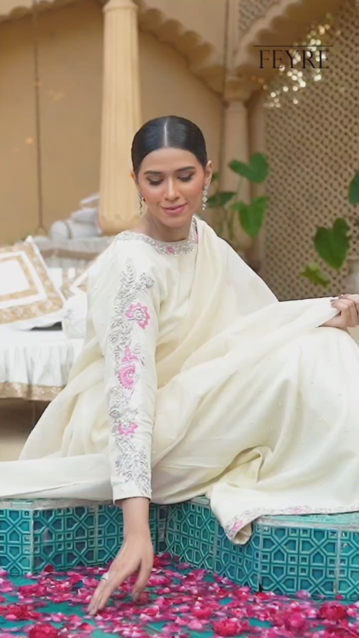 We specialize in the artistry of handmade embroidery, where each stitch is meticulously crafted to create a garment that exudes elegance and sophistication. Our signature three piece Korean raw silk dress feature the timeless charm of off-white, a canvas for the exquisite details of French top threadwork, adorned with delicate pearls and sitara. Styled with pure organza dupatta.