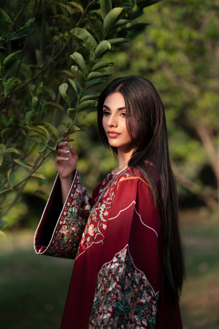 A timeless maroon ensemble that embodies warmth and poise. Blush features intricate machine embroidery across the front and sleeves, celebrating refined craftsmanship with a contemporary silhouette.