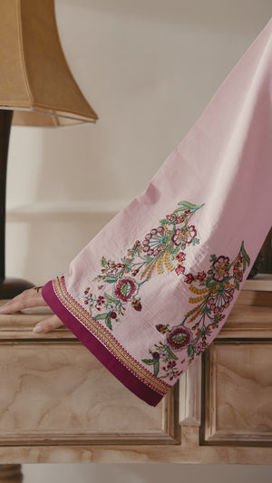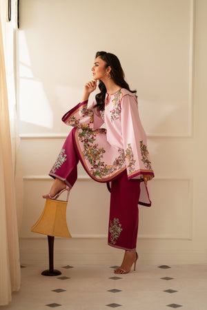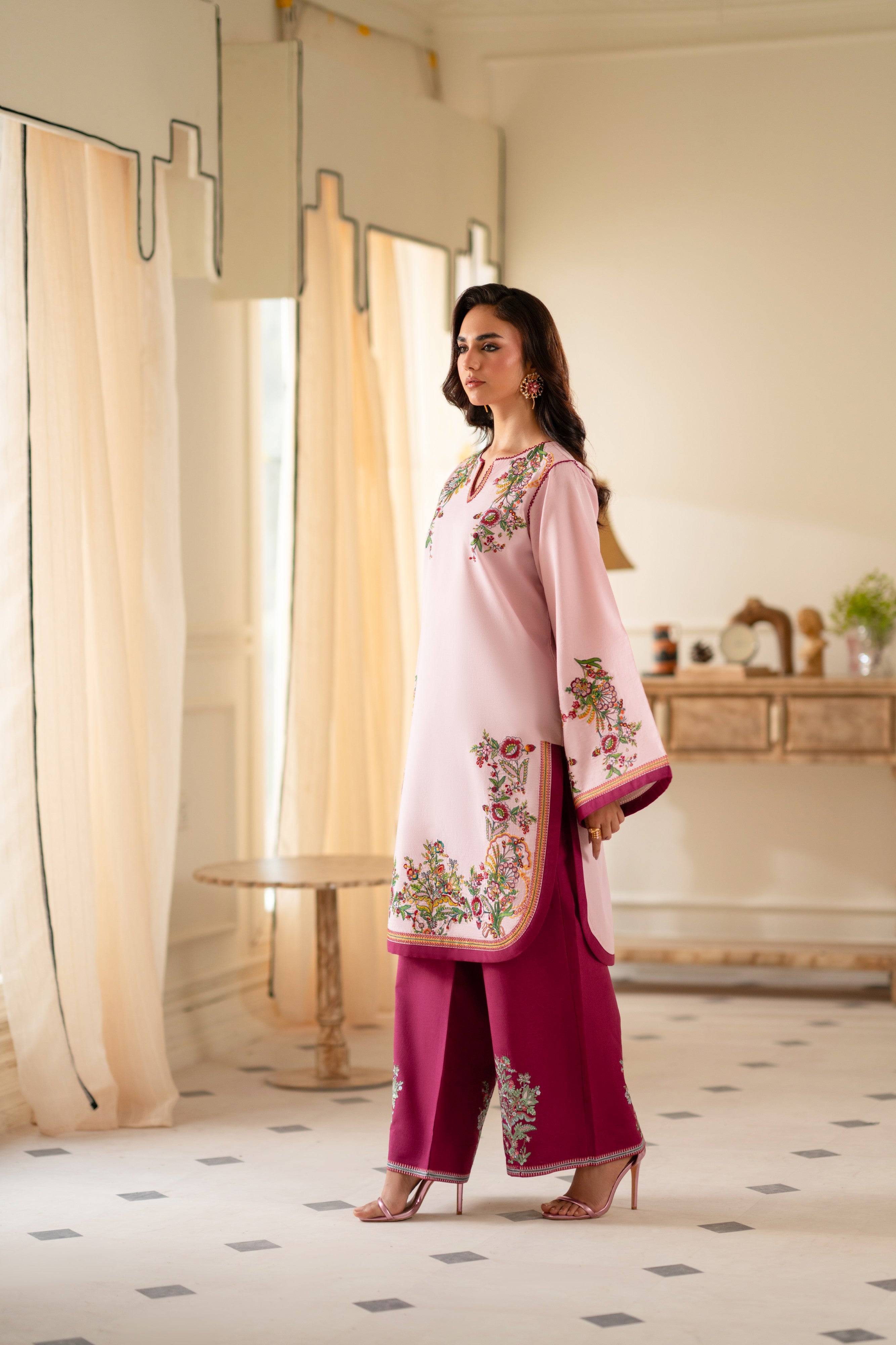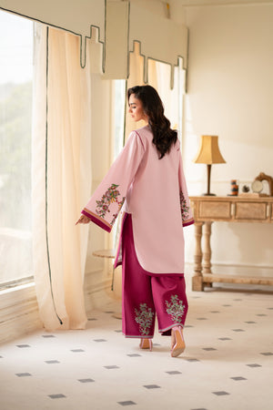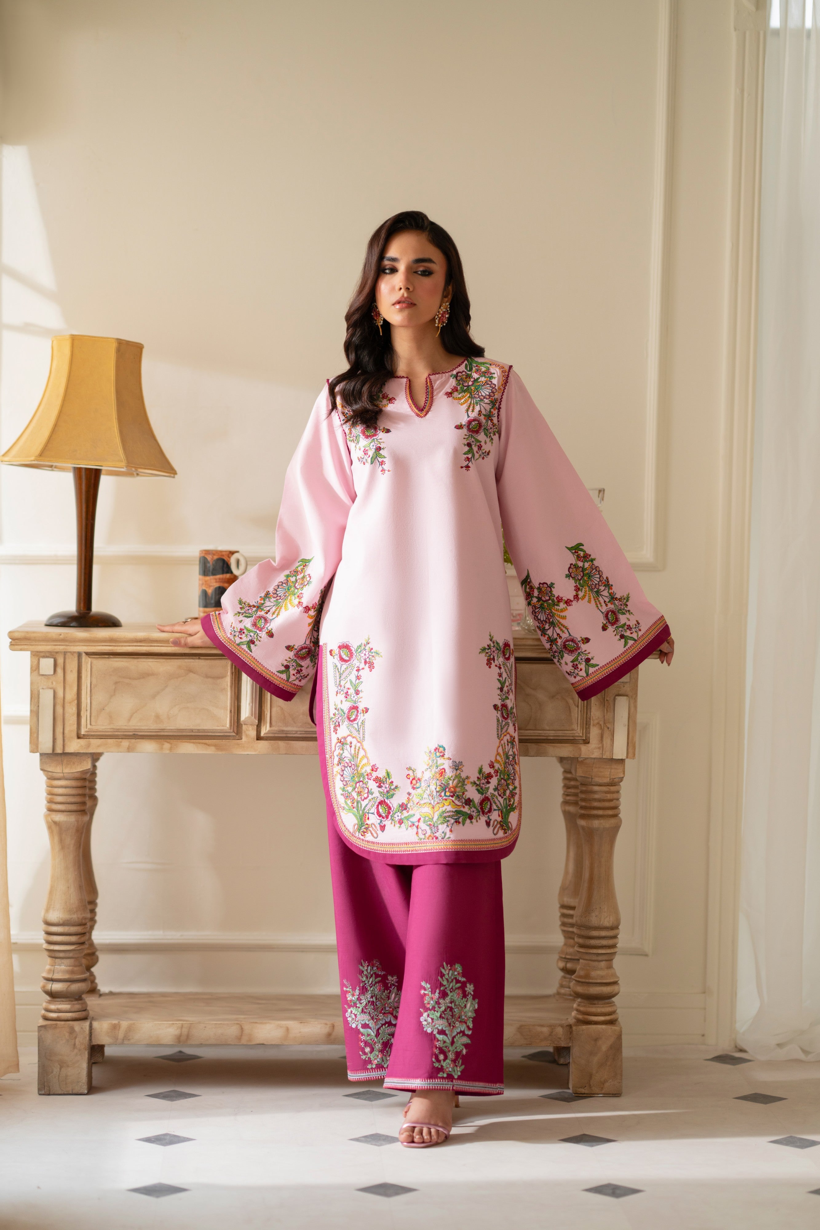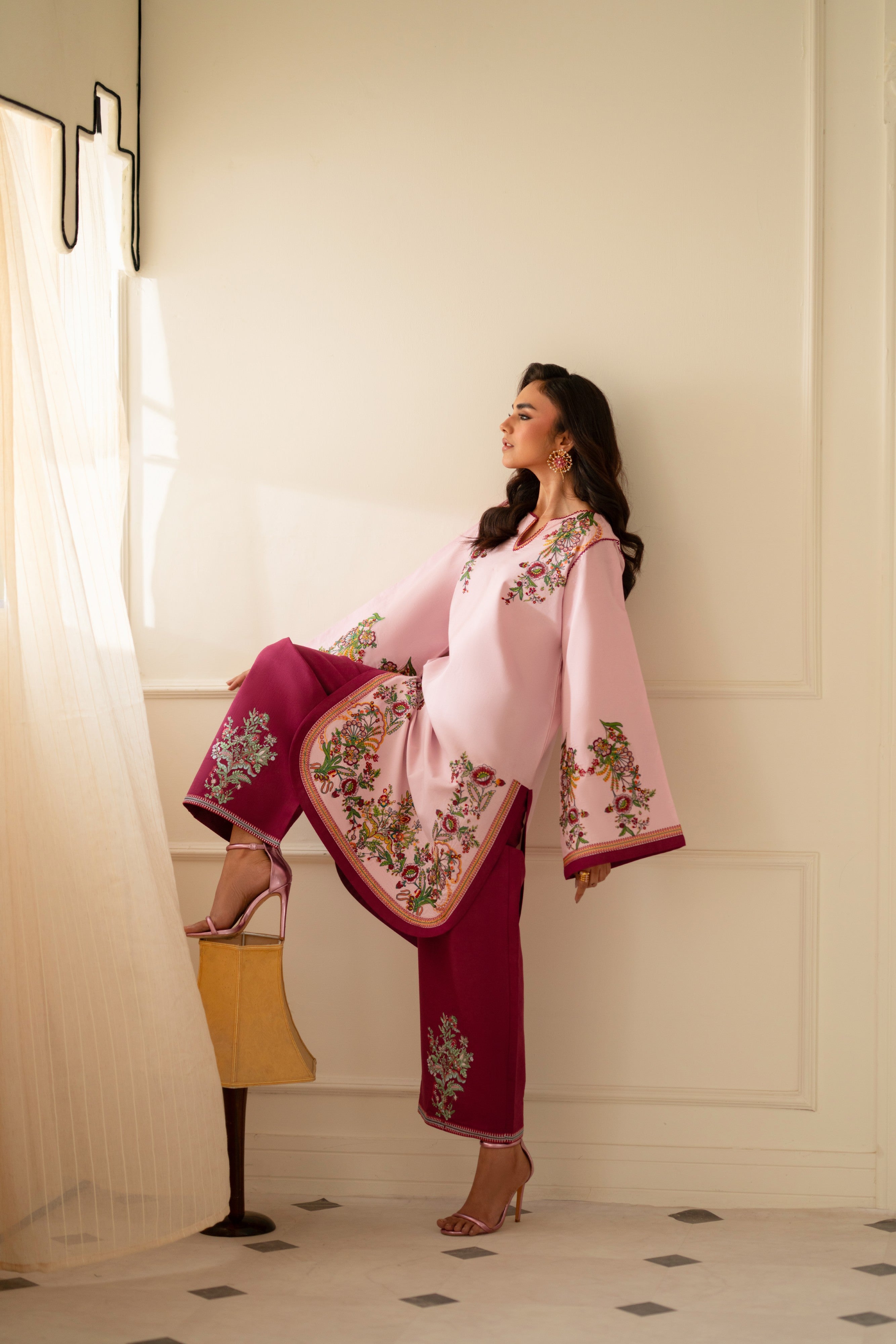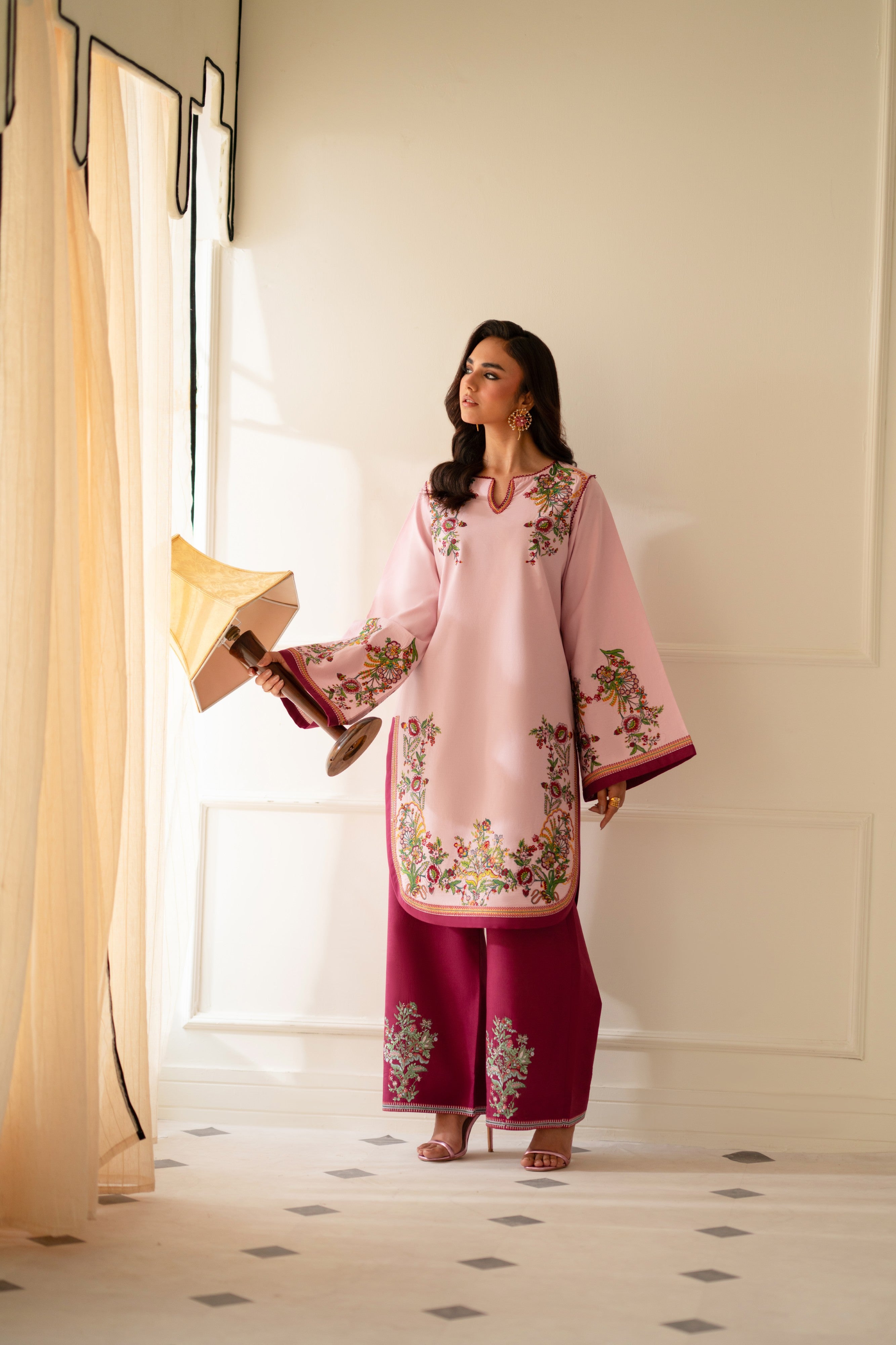 Make a statement with our light pink two-piece stitched dress, paired with dark pink embroidered trousers. The harmonious color combination and intricate embroidery create a truly refined and executive look, perfect for high-end occasions.