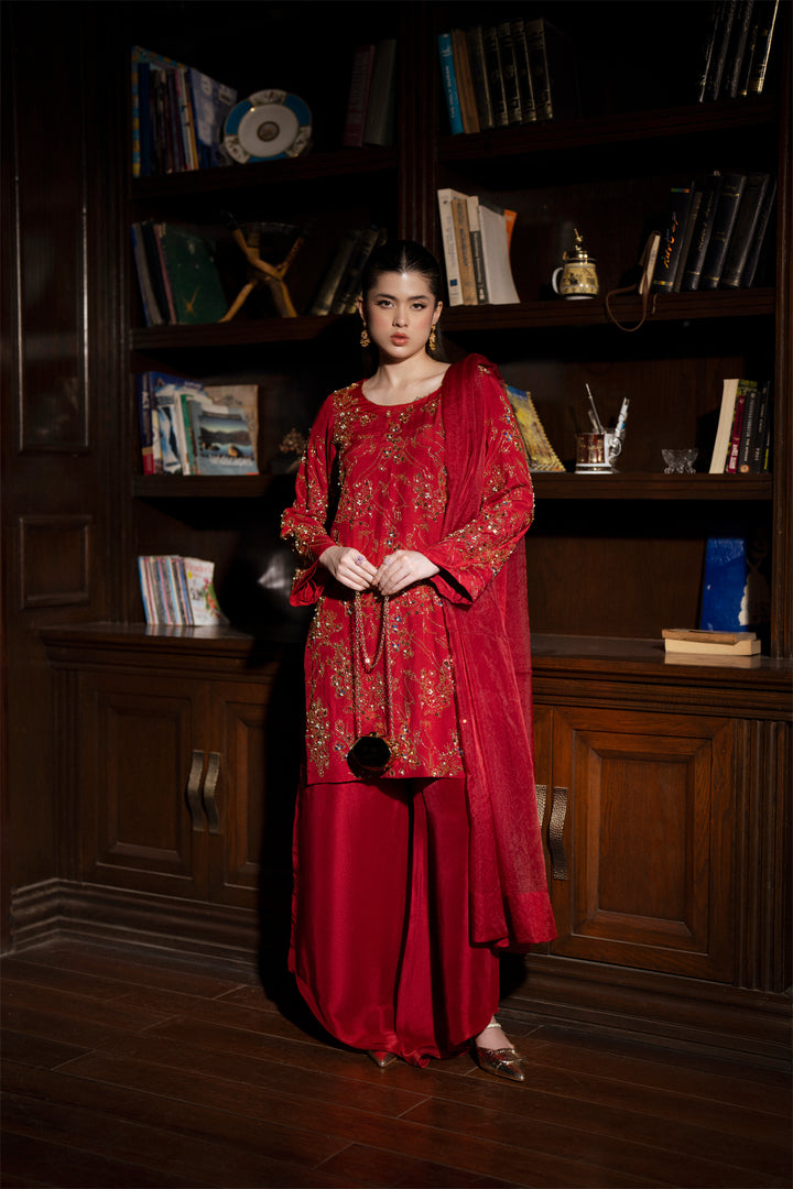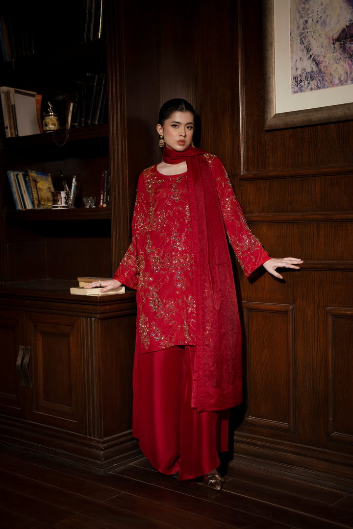 Our Nature-Inspired Article captures the beauty and spirit of the wild in Feyre’s signature style. This deep maroon ensemble features a heavily embroidered deer motif, intricately crafted with imported cut dana, sitara, and pearls, reflecting a fusion of elegance and strength. Paired with a modern tailored trouser and a simple organza dupatta, the design beautifully balances statement craftsmanship with understated sophistication — a true expression of Feyre’s artistic connection to nature.